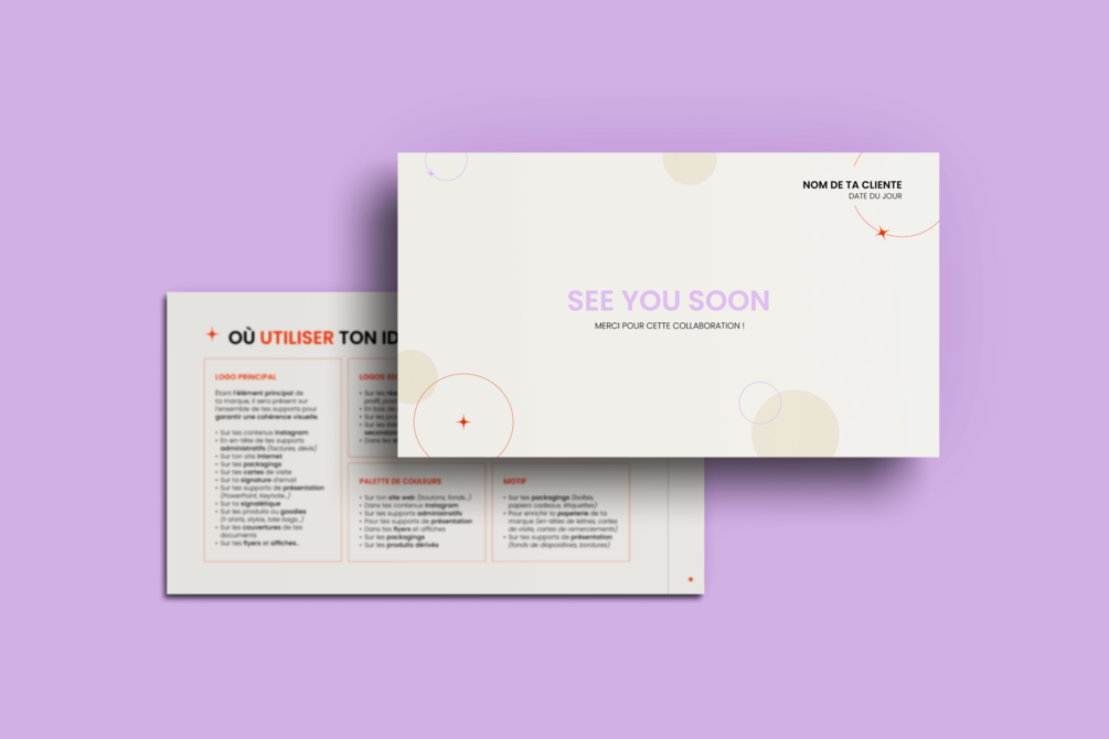 • Où utiliser ton identité visuelle (logo principal, logos secondaires, palette de couleurs, éléments graphiques, motif) ?
