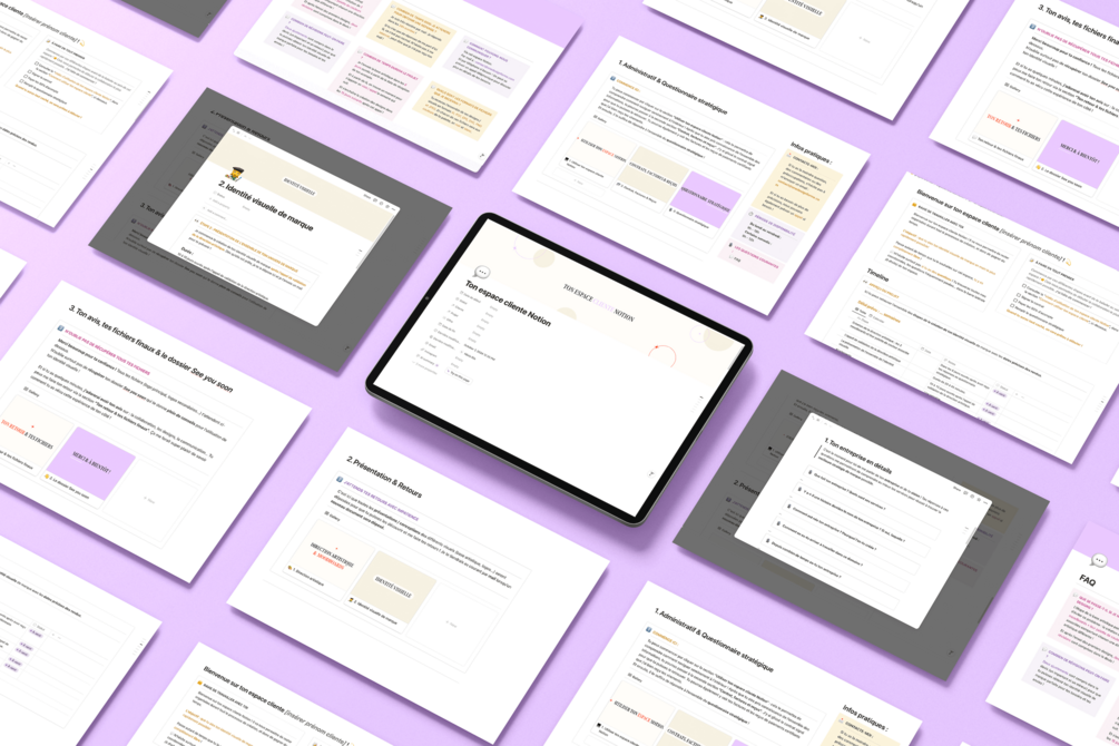 Espace client Notion - prêt à l'emploi et personnalisable, template pour graphiste & freelance créatif, en français